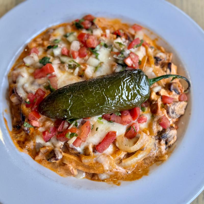 Blend of four melted cheeses, diced chiles, pico de gallo, cilantro