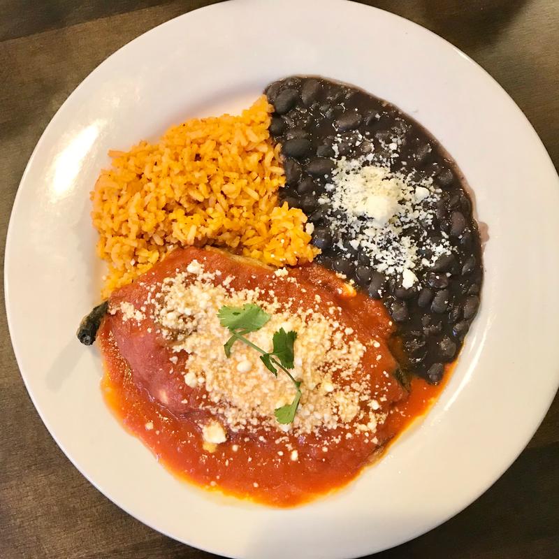 Jack cheese filled poblano chile, spicy tomato sauce